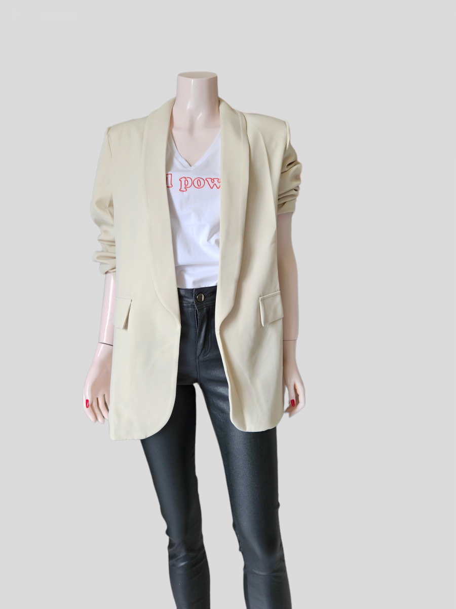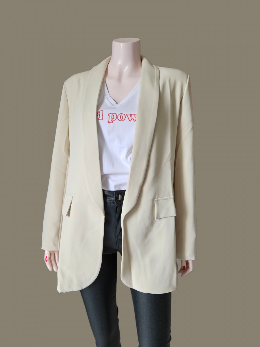 Blazer uni beige. Avec épaulettes. Fausses poches. 100% Polyester. Fabriqué en Italie.