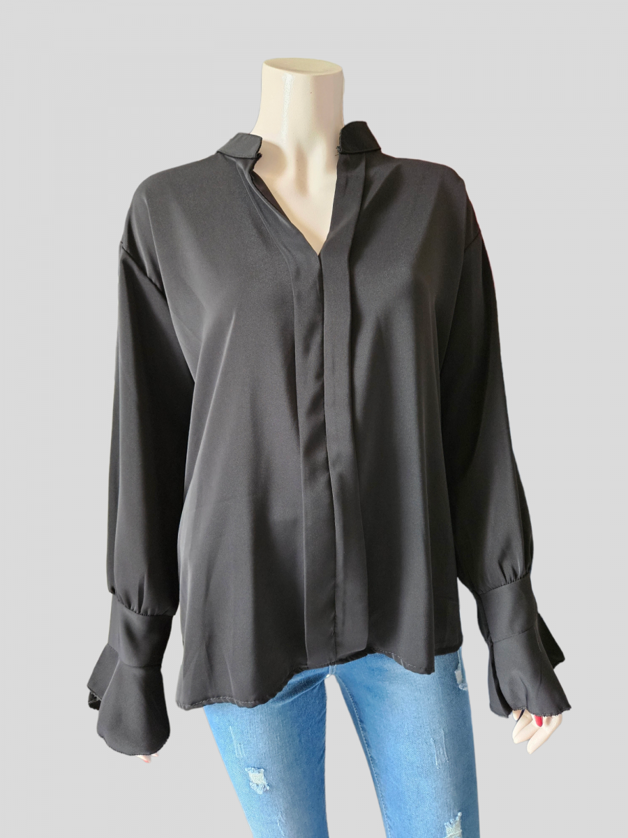 Blouse satinée fluide avec manches longues à volant. 100% Polyester.