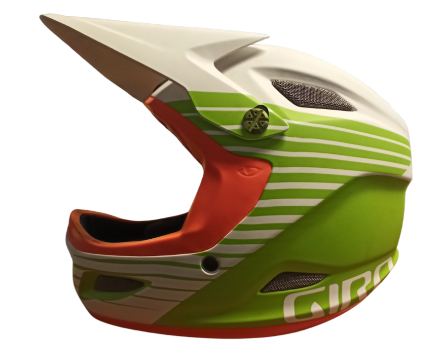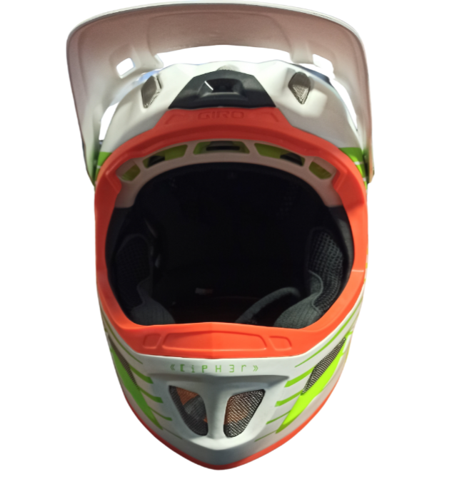 Taille: S 54-56 , L 60-62 Casque Giro Cipher Blanc Mat / Vert Lima / Orange. Casque très léger pour freeride, descente et enduro, avec carcasse en fibre de verre, intérieur avec rembourrage à plusieurs couches X-Static et entrées d’air à la partie frontale pour une réfrigération et un confort parfaits. Intègre visière P.O.V. amovible sans outils, mentonnière en Vinyl Nitrile et haut-parleurs TuneUps avec commande O-Snap.