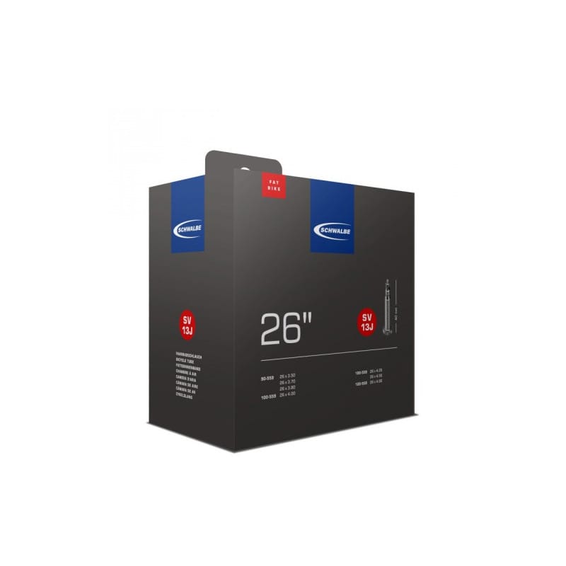 La chambre à air Schwalbe n°13J est spécialement conçue pour les fatbikes avec pneus larges 26″ (ETRTO 90/120-559), offrant un volume important pour un confort optimal. Fabriquée en butyl de haute qualité avec une épaisseur de paroi uniforme, elle assure une excellente rétention d’air et une fiabilité éprouvée. Idéale pour les pratiques tout-terrain sur pneus larges jusqu’à 120 mm, elle garantit durabilité et performance, avec une valve Schrader de 40 mm facilitant son utilisation.