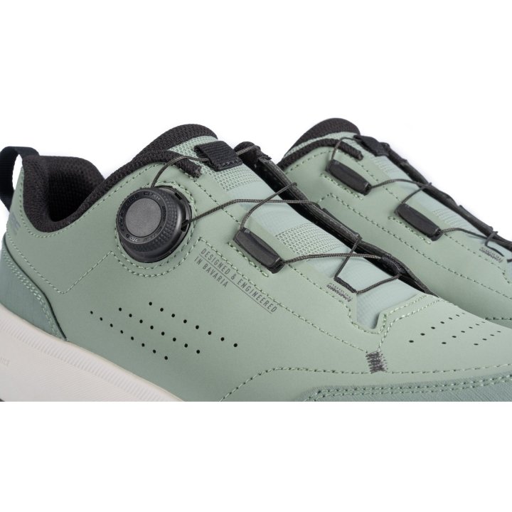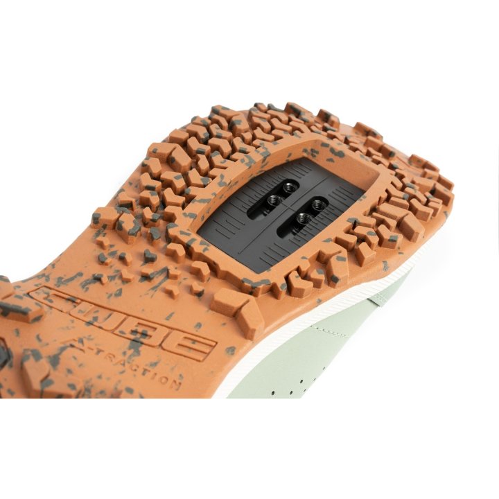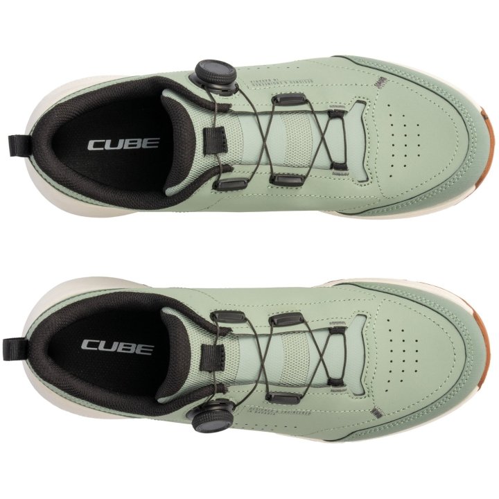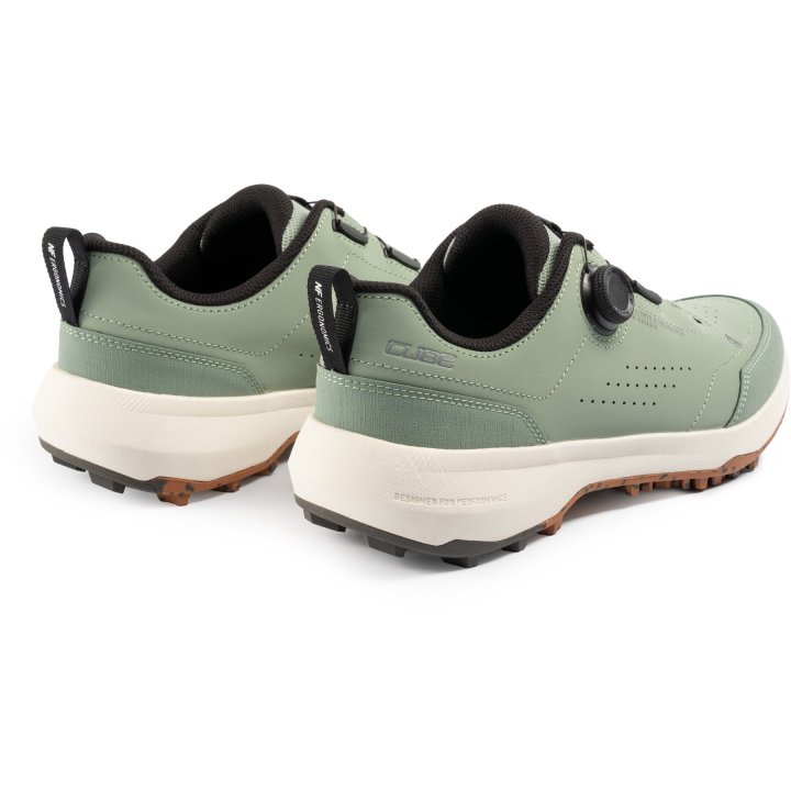 Chaussures Cube OX Pro Vert La chaussure CUBE OX PRO, conçue pour un style de vie actif en plein air, allie un style décontracté à une pratique robuste. Un renfort interne en nylon offre rigidité et soutien pour un pédalage efficace, tandis qu’une semelle intermédiaire en EVA amortissant les chocs et la semelle extérieure en caoutchouc A-TRACTION ajoutent traction et flexibilité pour les passages en dehors du vélo.