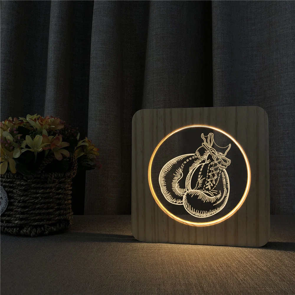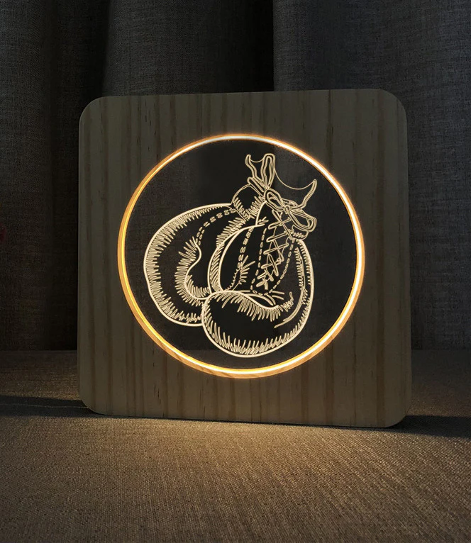 Jolie veilleuse gants de boxe pour chambre d’enfant. Cette veilleuse Led d’une paire de gants de boxe lumineux insérée à un jolie support et cadre en bois apportera apaisement et réconfort pour une douce nuit