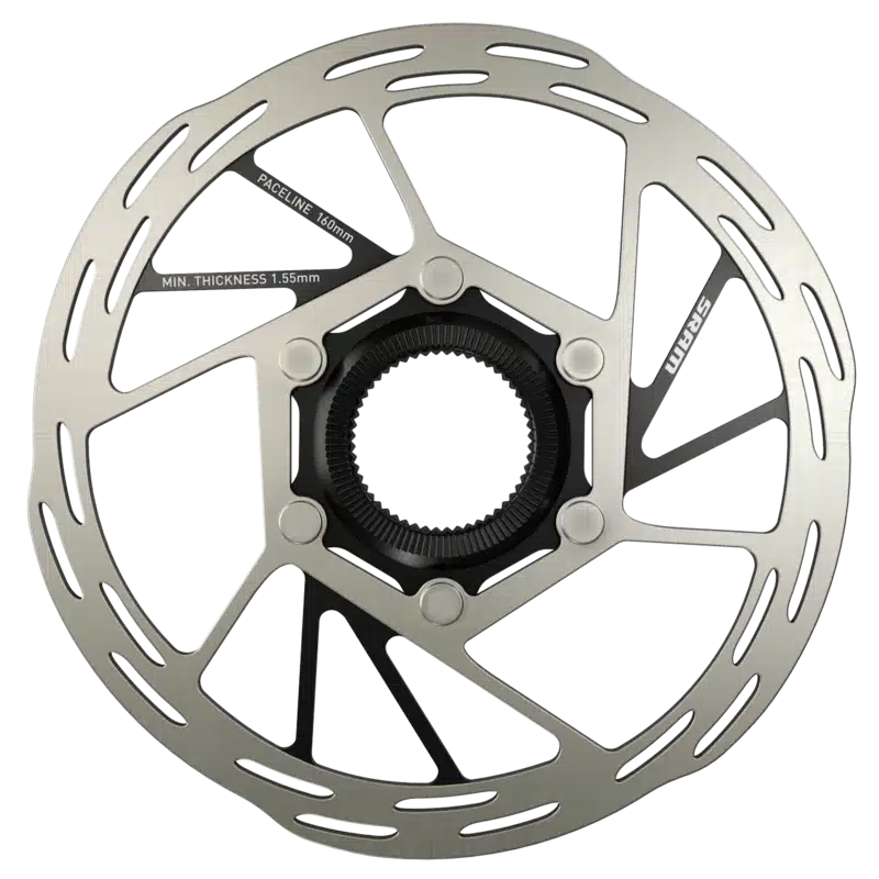 Le disque de frein SRAM Paceline reprend la conception élégante des groupes eTap AXS pour la route. Il intègre une nouvelle surface de freinage ajourée pour des performances de freinage silencieuses et efficaces.