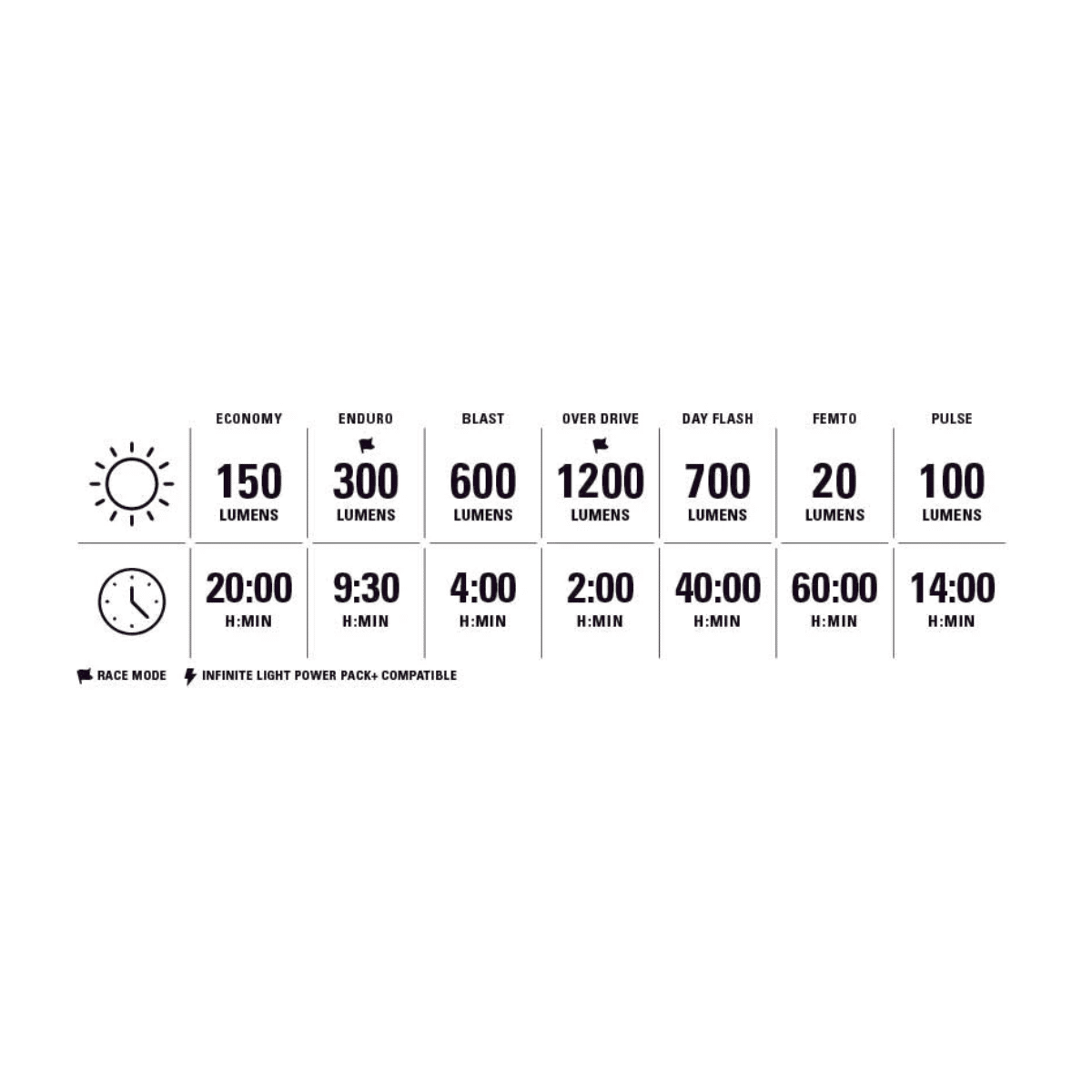 Avant 1200 Lumens / Arrière 400 Lumens Autonomie Max : 60h Recharge : USB