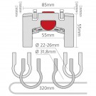 Fixation pour cintre OS/22-26 + 2colliers Si vous souhaitez laisser votre panier sans risque sur votre vélo, choisissez la fixation de cintre à serrure. La fixation pour cintre transforme rapidement votre VTT en un vélo de ville avec panier pour les courses. Avec crochets pour cintre standard Ø 22-26 + oversize pour Ø 31.8mm.Même avec des charges lourdes, le câble de sécurité breveté s’assure que votre fixation reste bien en place et ne penche pas vers le bas.