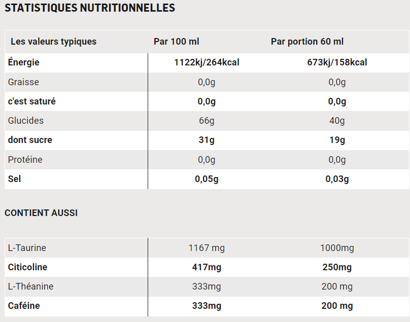 - Eau, maltodextrine (de maïs) (29%), fructose (22%), L-Taurine, Cognizin(R) Citicoline, Caféine Anhydre, L-Théanine, Arômes, Régulateurs d’acidité (Acide citrique, Citrate de Sodium), Gélifiants ( Gomme Gellane, Gomme Xanthane), Conservateurs (Benzoate de Sodium, Sorbate de Potassium), Chlorure de Sodium.