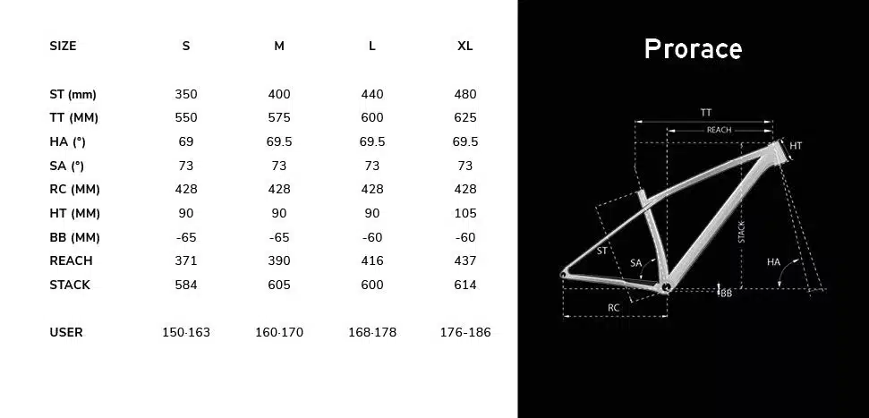 (👉 Ces chiffres sont indicatifs : chaque taille conserve la même géométrie optimisée avec un angle de direction de 69° et un angle de tube de selle de 73°.)