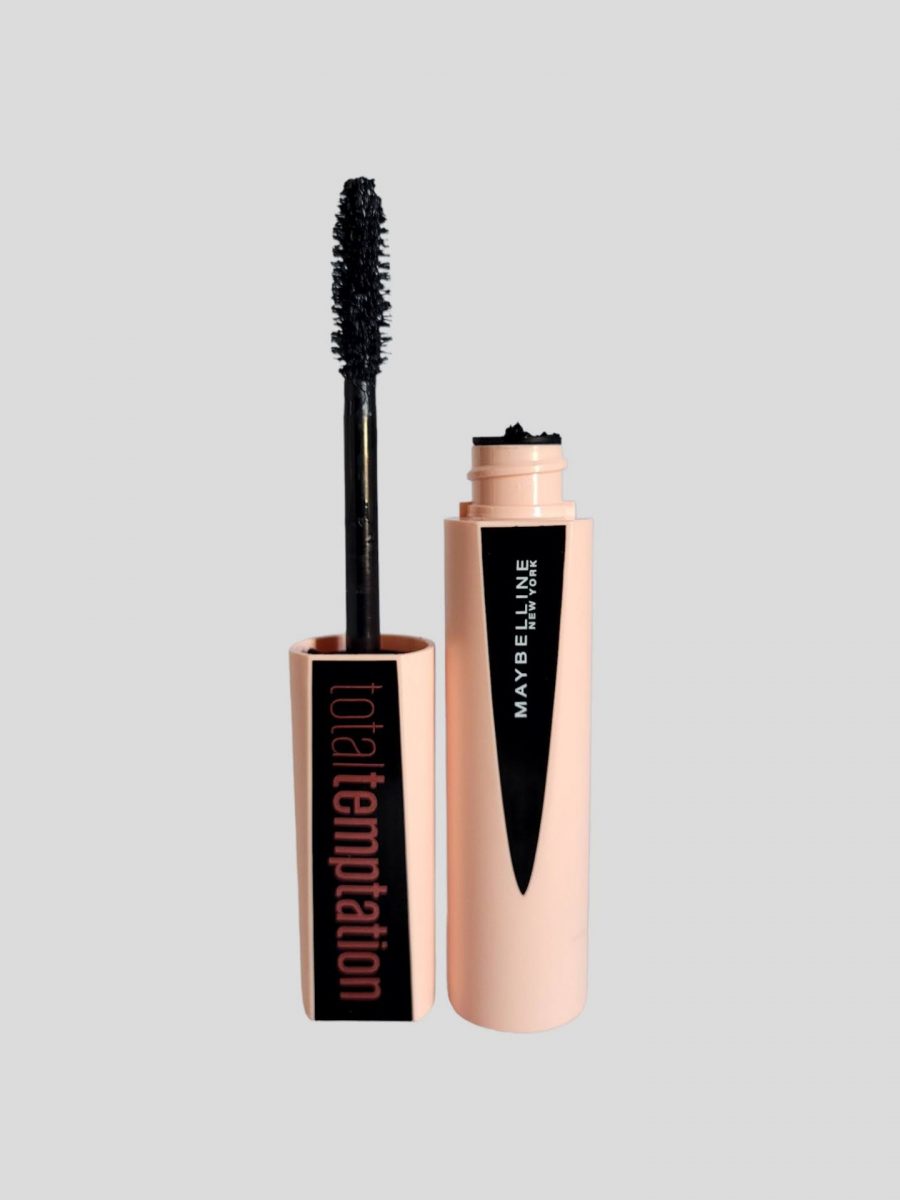 Mascara Noir Total Temptation Maybelline. Cedez à la tentation du volume indécent . Sa brosse généreuse étire et enrobe tous vos cils pour un volume fourni, sans paquet, irrésistible. Une application addictive grâce à une formule enrichie à l’extrait de coco et à un parfum sensuel.