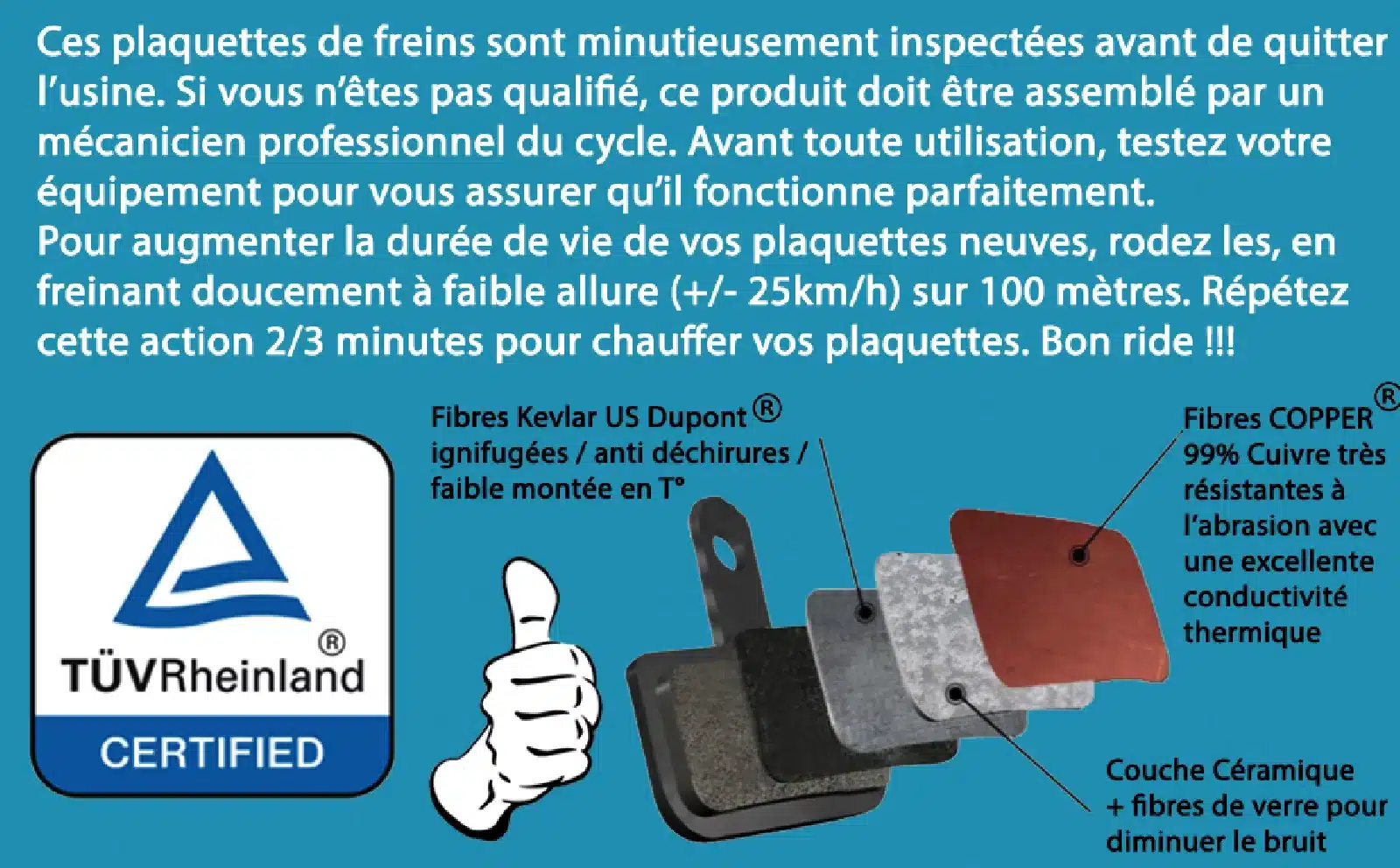 Conçues pour offrir un excellent équilibre entre puissance de freinage, durabilité et silence de fonctionnement, ces plaquettes sont enrichies en particules de cuivre (Cooper), fibres de Kevlar (US Dupont), particules céramiques et fibres de verre. Cette combinaison limite la montée en température, réduit le bruit au freinage et diminue le risque de glaçage. Elles sont particulièrement adaptées aux pratiques exigeantes comme l’enduro, la descente (DH), le freeride, ainsi qu’aux VAE (e-bikes), avec une efficacité constante par temps sec ou humide. Inclus : ressort de rappel + goupille de fixation. Compatibilités : Shimano : BR-C501, BR-M575, BR-M525, BR-M495, BR-M486, BR-M485, BR-M475,…