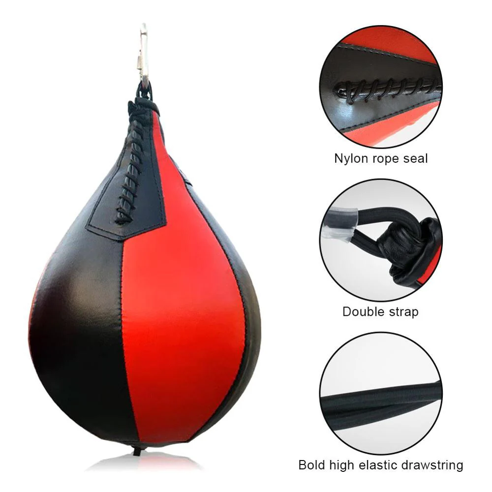 Cette poire boxe en Cuir PU de première qualité avec coutures soignées et laçages robuste, de couleur NOIR et ROUGE est certainement l’outil indispensable pour tout boxeur souhaitant travailler, améliorer et optimiser sa rapidité d’exécution et développer sa coordination. Equipement boxe professionnel conçu et fabriqué pour répondre aux besoins des boxeurs de classe mondiale