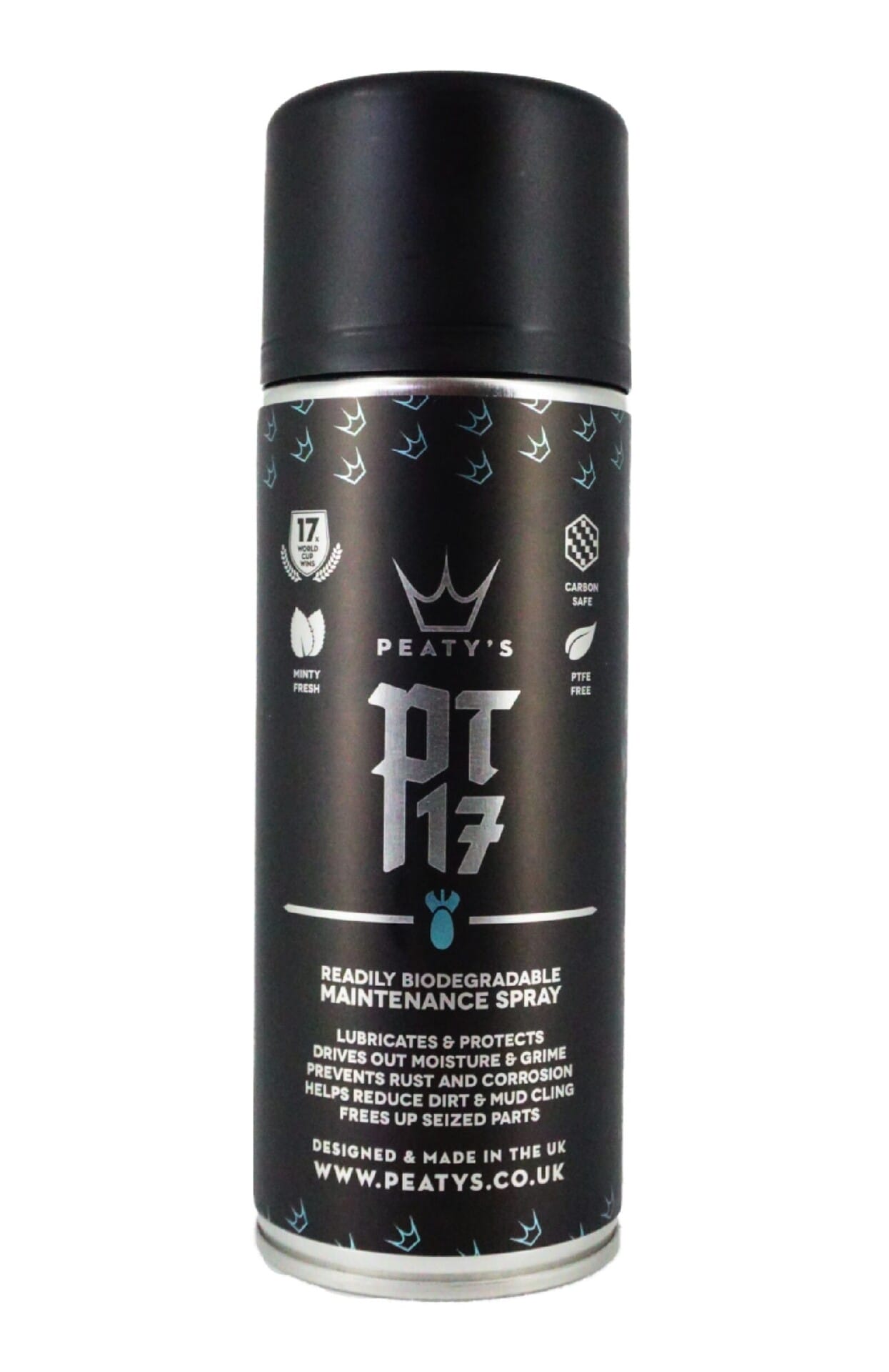 Développé en collaboration avec Steve Peat (17 victoires en Coupe du monde de DH) et les scientifiques Peaty’s, le PT17 est un spray d’entretien multifonction, sans PTFE, conçu pour lubrifier, protéger et prolonger la durée de vie des composants de votre vélo. Sa formule sans PTFE, facilement biodégradable, associe une technologie anticorrosion avancée à un mélange précis d’huiles, idéal pour une utilisation à la fois en atelier professionnel ou à domicile. Fonctions principales :• Déplace l’humidité après lavage• Laisse un film lubrifiant anticorrosion sur les pièces métalliques• Protège pédaliers, axes, visseries, etc.• Facilite le démontage des pièces grippées• Réduit l’adhérence…