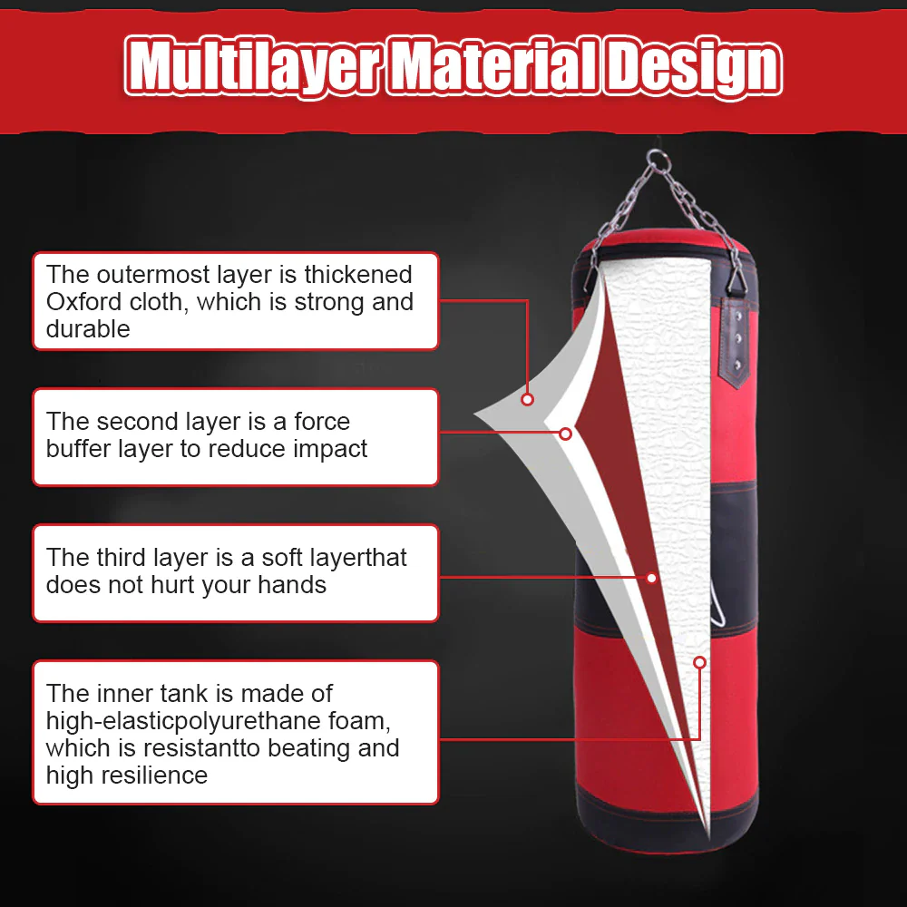 L’enveloppe du sac se compose de 3 couches distinctes de toiles (tissus épais multicouche à haute densité) et d’une couche de cuir permettant d’encaisser et de répartir les impacts des coups successifs tout en protégeant vos mains.