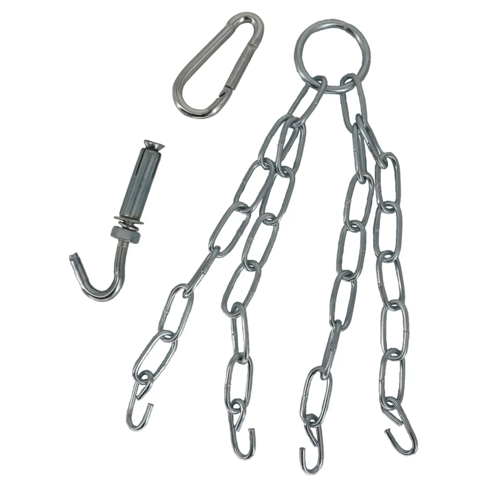 Set complet comprenant : chaîne en acier 4 brins + pivot métallique + mousqueton + cheville métallique à expansion pour fixation au plafond.