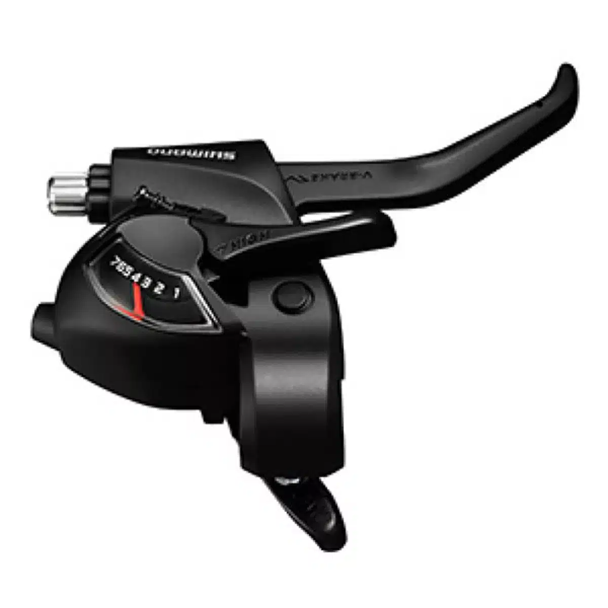 La manette gauche Shimano ST-EF41 fait partie de la gamme Tourney, conçue pour les transmissions triple plateaux (3×7 vitesses). Elle intègre à la fois le levier de vitesses et le levier de frein dans un design ergonomique, parfaitement adapté aux vélos de loisir ou de trekking.