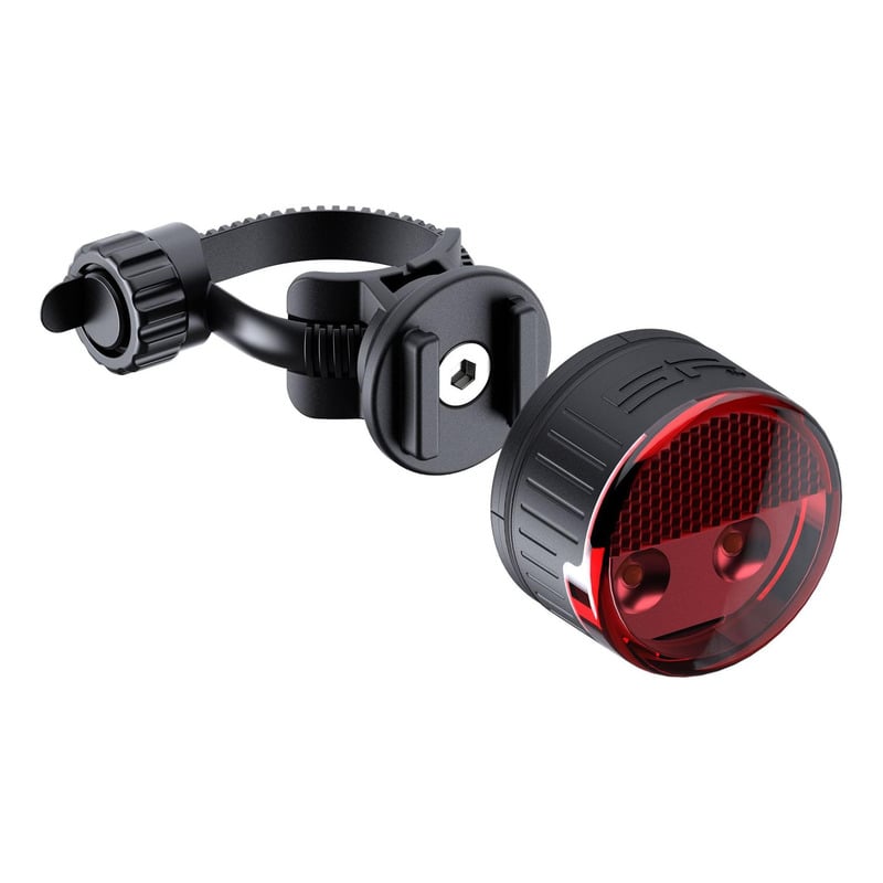 Description : Éclairage arrière avec support pour tige de selle. Fabrication légère résistante aux intempéries. 2 modes de fonctionnement (fixe et clignotant). Fixation de l’éclairage sur la tige de selle. Mécanisme de fixation « Twist to lock » facile, sûre et rapide (quart de tour). Compatible avec toutes les selles. Batterie rechargeable via USB. 100 Lumens maximum. Fixation sécurisée.