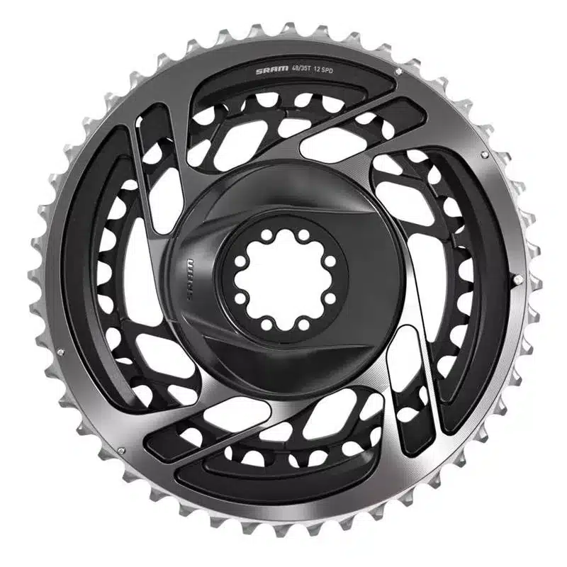 Kit de plateaux SRAM Red AXS 2×12 vitesses (46/33 dents) avec fixation Direct Mount 8-bolt. Optimisé pour les transmissions électroniques 12 vitesses route, offrant un passage de vitesses fluide, léger et rigide, idéal pour les cyclistes exigeants.